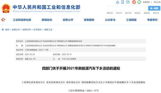 工業(yè)和信息化部辦公廳 農(nóng)業(yè)農(nóng)村部辦公廳 商務(wù)部辦公廳 國家能源局綜合司關(guān)于開展2021年新能源汽車下鄉(xiāng)活動(dòng)的通知